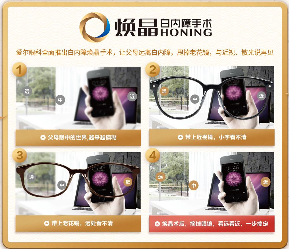 依托全球化连锁优势,爱尔眼科全面推出焕晶白内障手术5S诊疗体系,更精准、更安全、更轻松,采用屈光性晶体术后不戴眼镜就可实现看近、看中、看远的全程清晰视力。